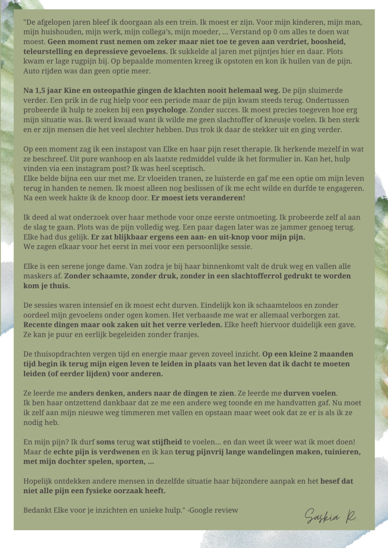 Ik wil jou graag helpen om je pijn te verlichten en er eens eindelijk blijvend van af te komen. De Pijn Reset Methode helpt je niet enkel pijnvrij worden, maar ook te groeien tot een zelfverzekerde, opgewekte en spontane versie van jezelf!
